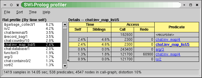 statistics.Browsing the annotated call-tree as described in section 4.39.3 itself is not very attractive. Therefore, the results are combined per predicate, collecting all callers and callees as well as the propagation of time and activations in both directions. Figure 5 illustrates this. The central yellowish line is the `current' predicate with counts for time spent in the predicate (`Self'), time spent in its children (`Siblings'), activations through the call and redo ports. Above that are the callers. Here, the two time fields indicate how much time is spent serving each of the callers. The columns sum to the time in the yellowish line. The caller <recursive> is the number of recursive calls. Below the yellowish lines are the callees, with the time spent in the callee itself for serving the current predicate and the time spent in the callees of the callee ('Siblings'), so the whole time-block adds up to the `Siblings' field of the current predicate. The `Access' fields show how many times the current predicate accesses each of the callees.