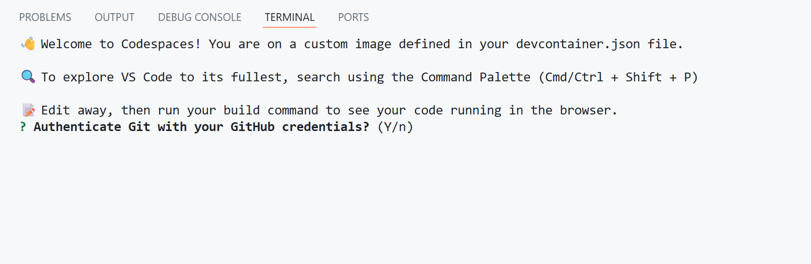 Once codespace is created (takes a while), you will see the following prompt in the integrated terminal: