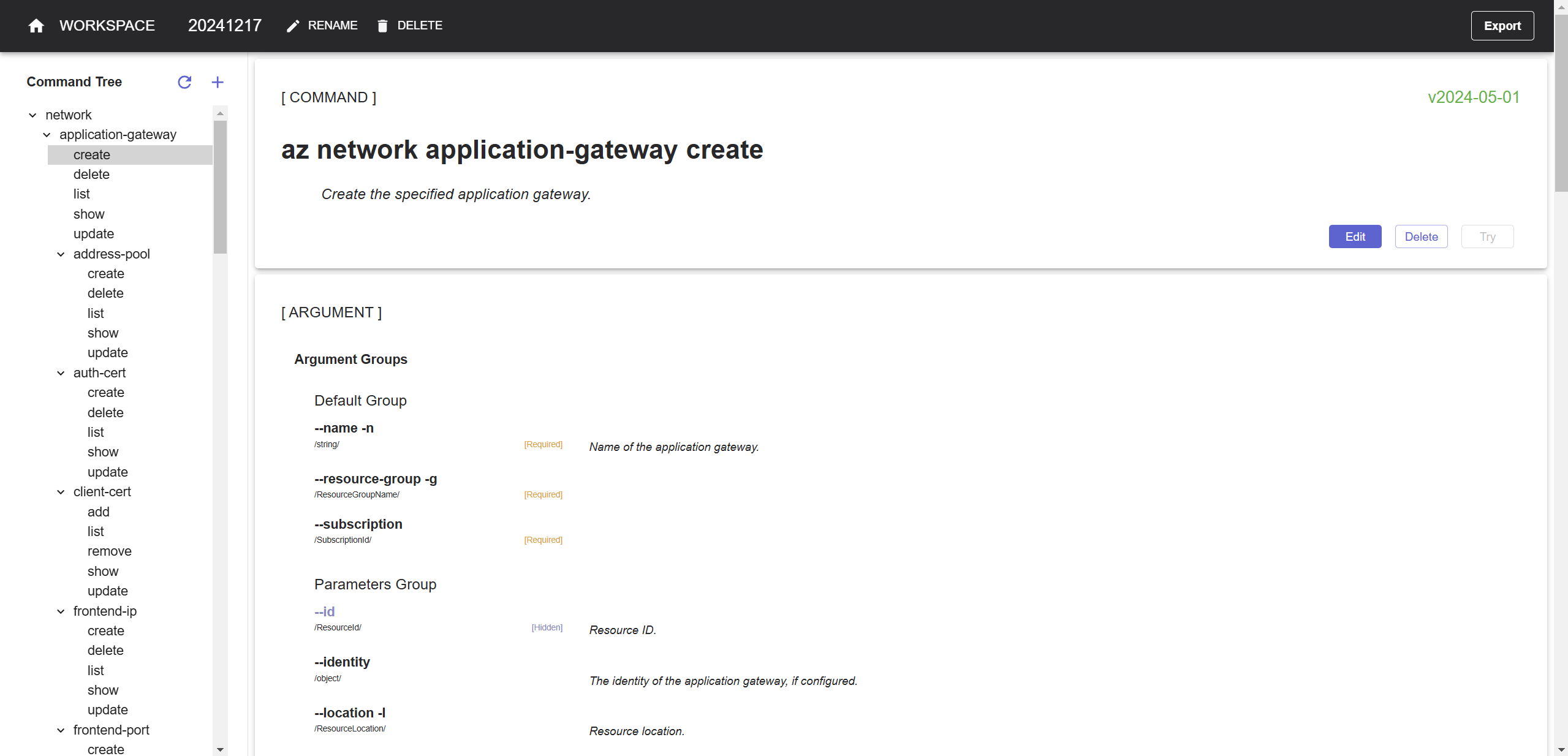 When you have completed all the editing in Workspace Editor and clicked EXPORT in its upper right corner. It's ready to switch to [CLI Generator](https://azure.github.io/aaz-dev-tools/pages/usage/cli-generator/) to generate code of Azure CLI: